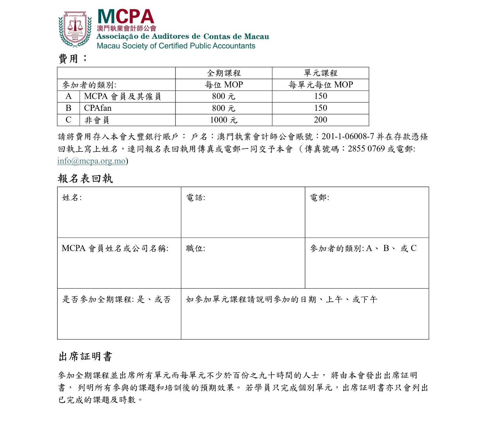 - 單元課程費用--澳門執業會計師公會會員、cpafan – 澳門幣150元/單元, 非會員 – 澳門幣200元/單元